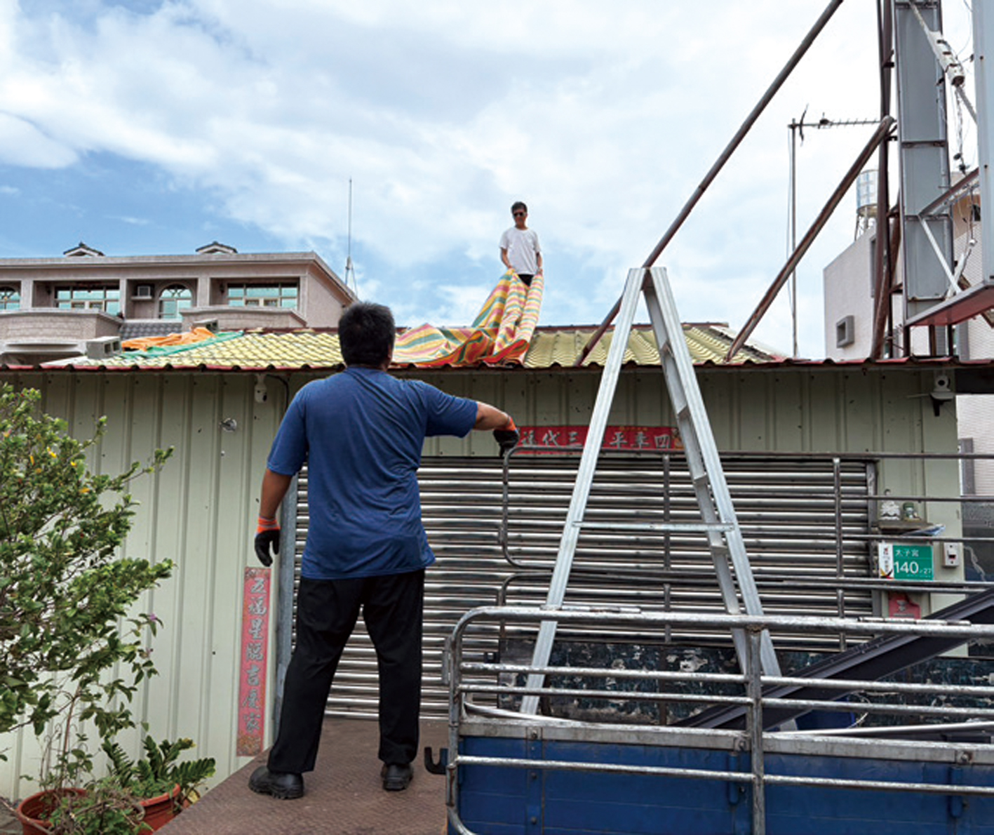 壯年部廖尚豪、林彥宏協助覆蓋受損屋頂