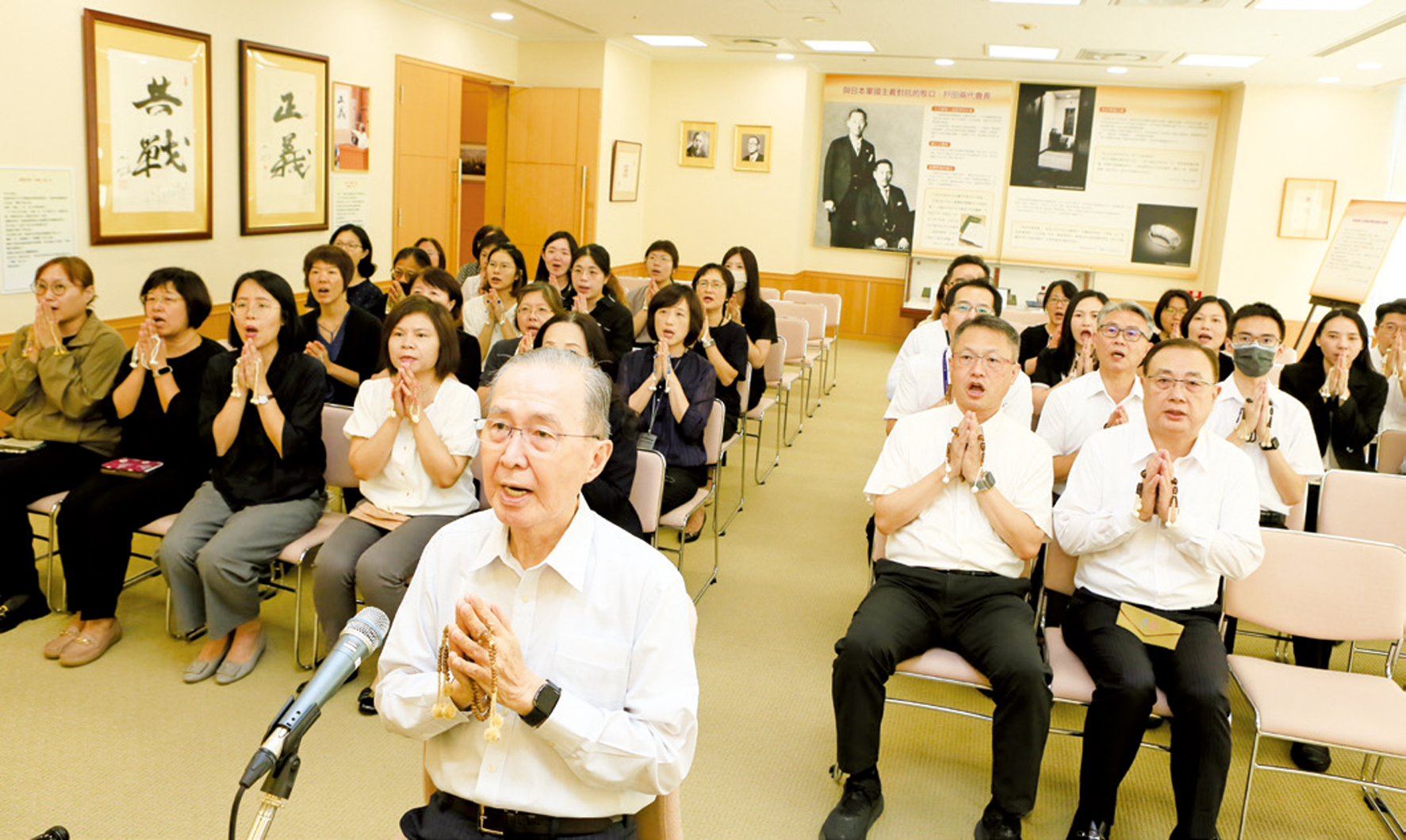 10月3日上午,林釗理事長帶領學會本部職員於至善文化會館恩師紀念室舉行「馬太鞍溪堰塞湖災害」追善祈福勤行會,以妙法題目為花蓮光復鄉不幸罹難的災民追善祈福,並祈求重建復原工作順利進行。