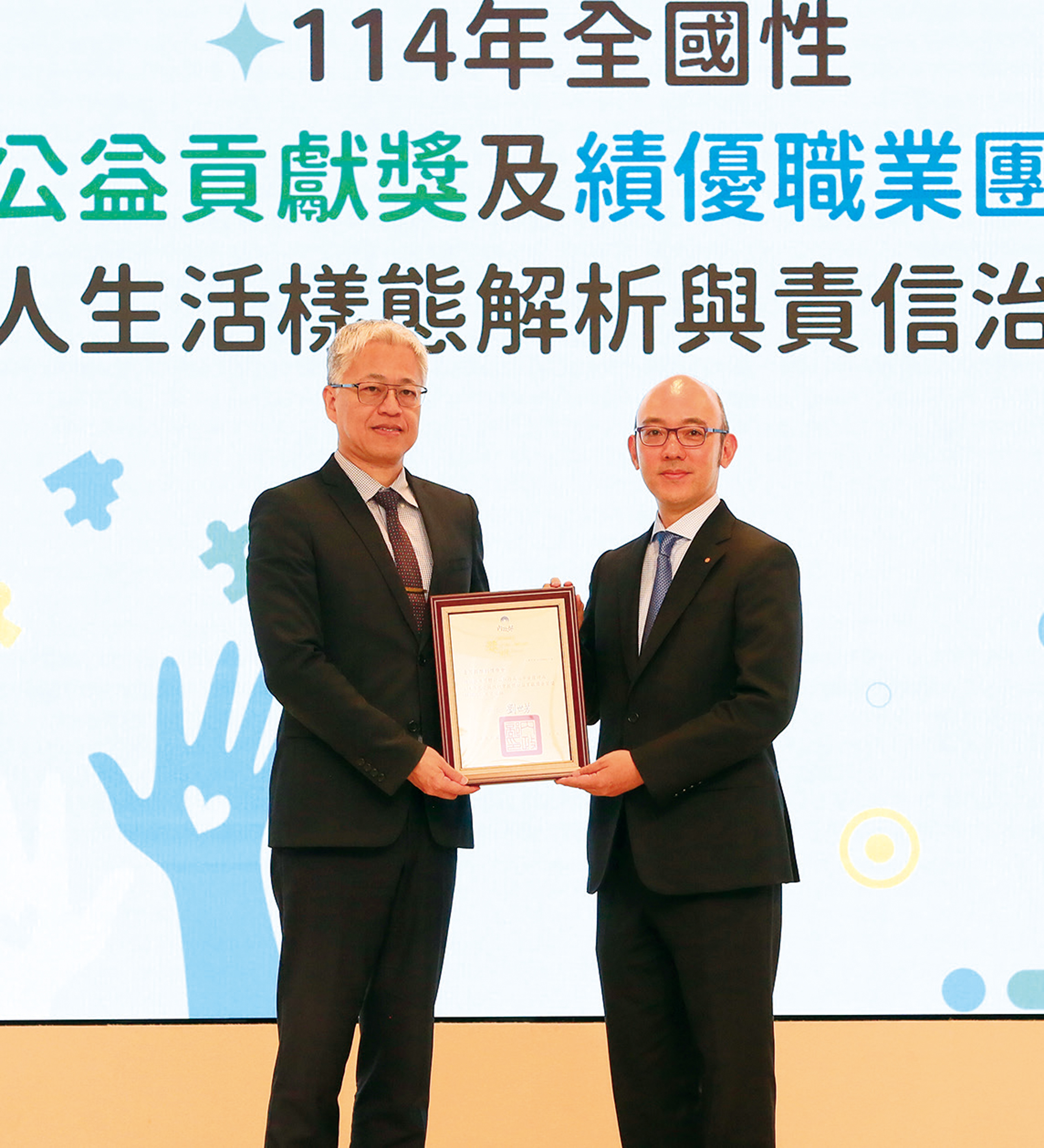 | 內政部常務次長吳堂安(左)頒發「社會團體公益貢獻獎 金質獎」給創價,共同執行長林澤(右)代表接受。 |