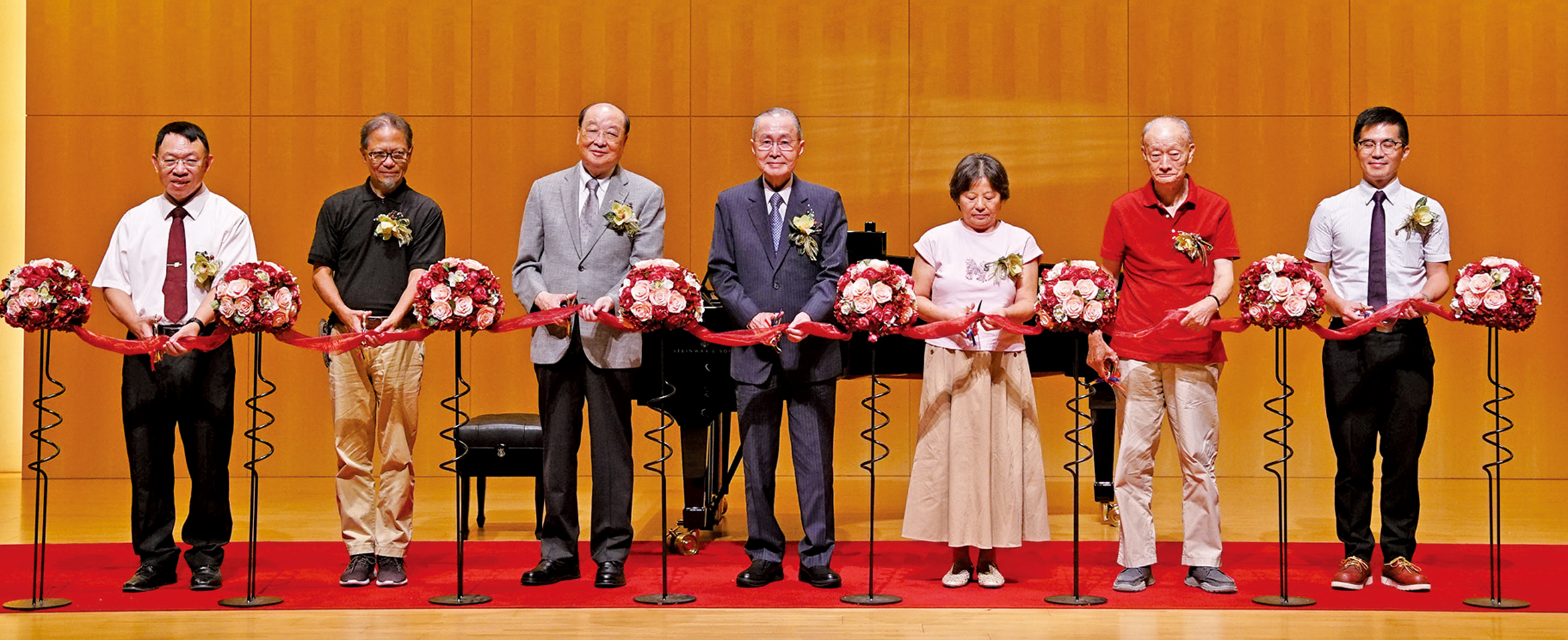 | 左起:蔣承志校長、洪世聰理事長、洪孟啟前文化部長、林釗理事長、嚴瑞滿女士、莊靈老師、徐仁斌校長。 |
