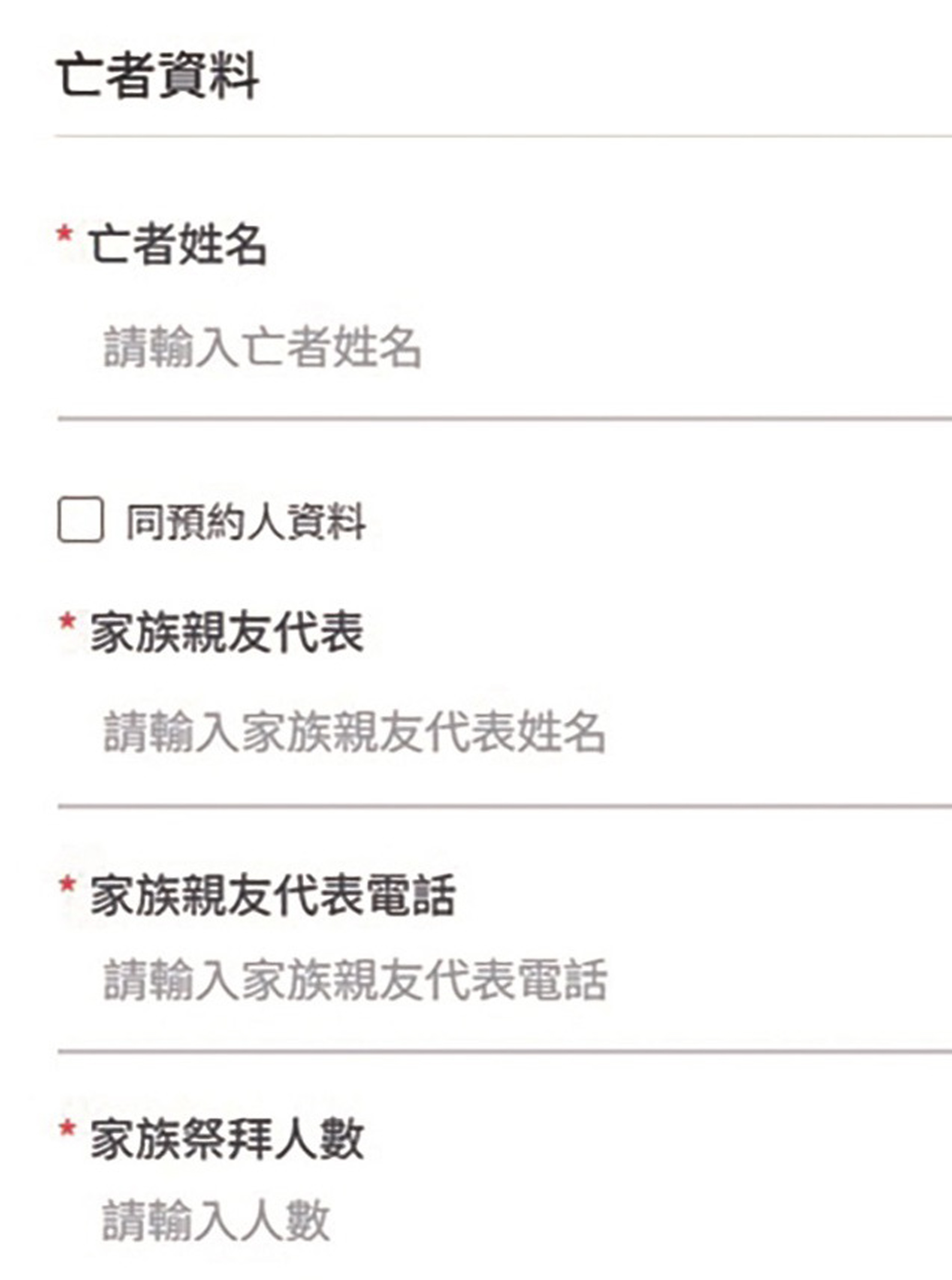 3.輸入預約資料(預約人姓名、手機號碼、日期、時段)、亡者資料(亡者姓名、家族親友代表、家族親友代表電話、家族祭拜人數)等必填資訊。