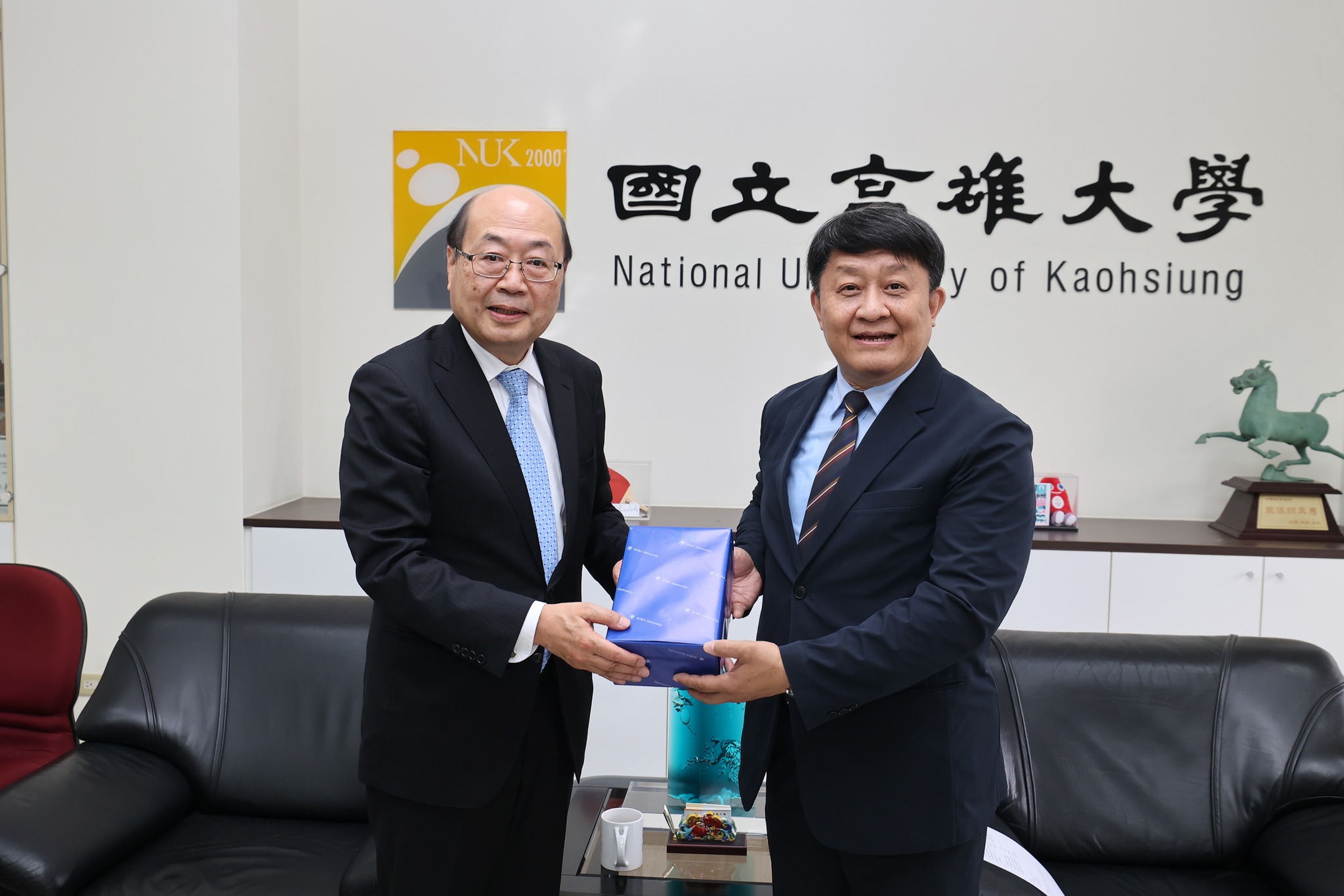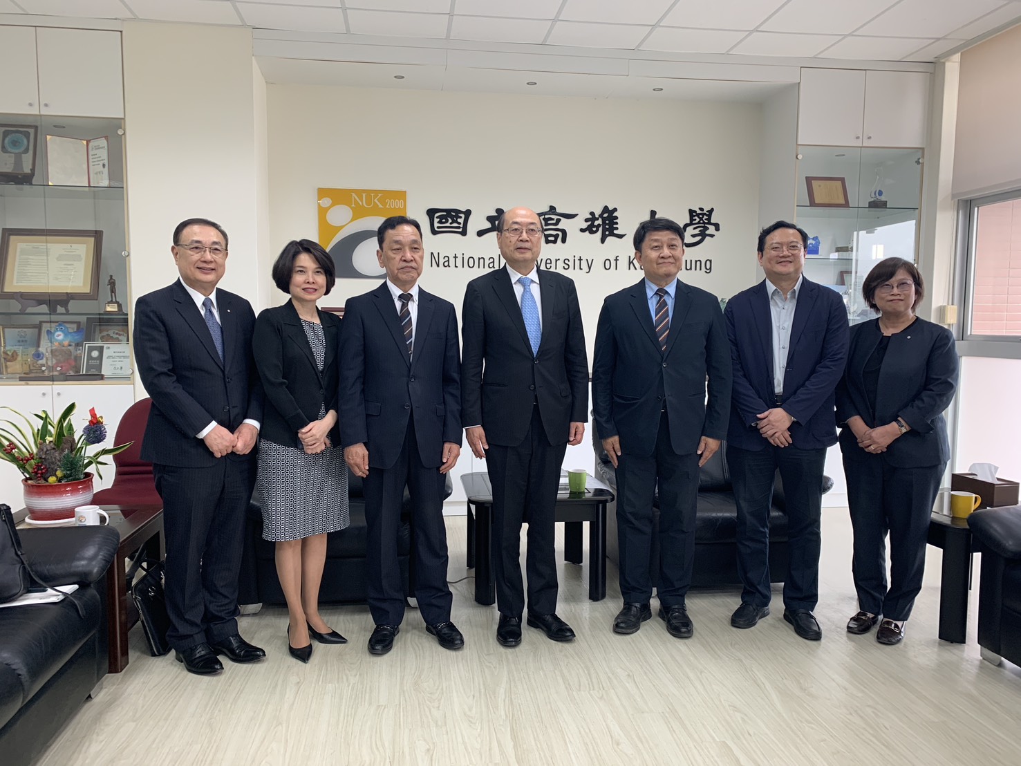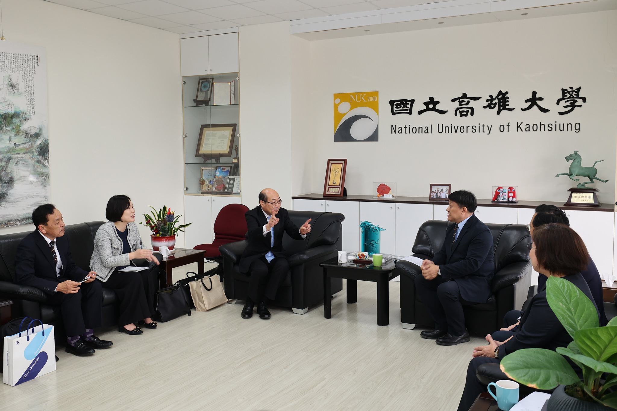 同日下午,一行人在共同執行長吳青蓉、常務副理事長洪玉柱等陪同下,訪問高雄大學,受到該校校長陳啟仁、副校長吳行浩、國際長林倖如的接待。