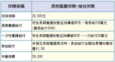 如果被保險人投保長期看護終身保險後,終身都很健康,那麼長期看護終身保險還是可以提供約定額度的身故保障,詳細保障內容需視個別商品而定。假設志銘目前年齡45歲,投保20年期長期看護終身保險,摘要列舉說明如下表: