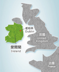 愛爾蘭位居歐洲的西端,與英格蘭相鄰(東北角1/6屬英國),形似無尾熊狀的島嶼, 面積70,273 平方公里。