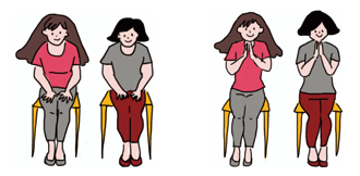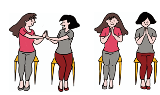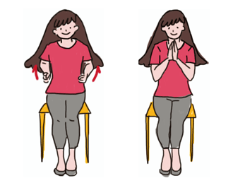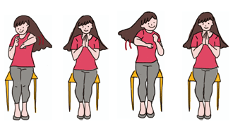 兩隻手肘一起往後,以打太鼓的方式向後敲兩下,接著兩手在胸前拍一下。