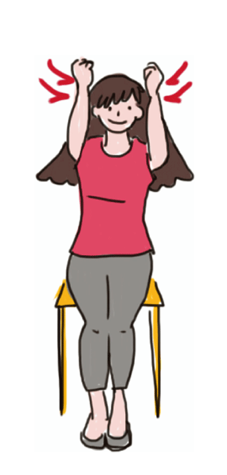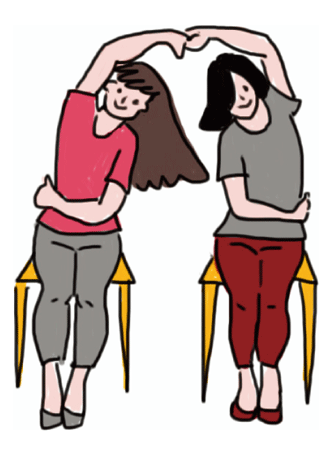 3慢慢將外側的手上舉,越過頭頂,與身旁夥伴握手,然後慢慢回復原本動作。