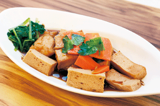 ◇作法 1. 百頁、紅蘿蔔切成適中尺寸,川燙後撈起。 2. 薑絲、蔥段爆香後,加入水、醬油、白砂糖、黑醋,熬煮成醬汁。 3. 百頁放入醬汁中,中火熬煮約7~10分鐘,百頁呈現琥珀色後可撈起。 4. 再將魚片放入醬汁,中火熬煮約5分鐘後撈起。 5. 將百頁及魚片放入盤中,淋上醬汁,放上綠蔥段、紅蘿蔔裝飾。