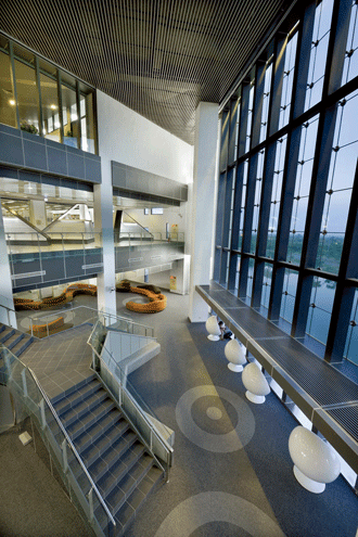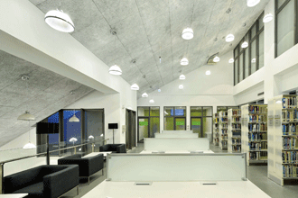 圖書館3-5樓一側為面海落地玻璃設計,挑高的建築、採光良好,現代感十足。 |