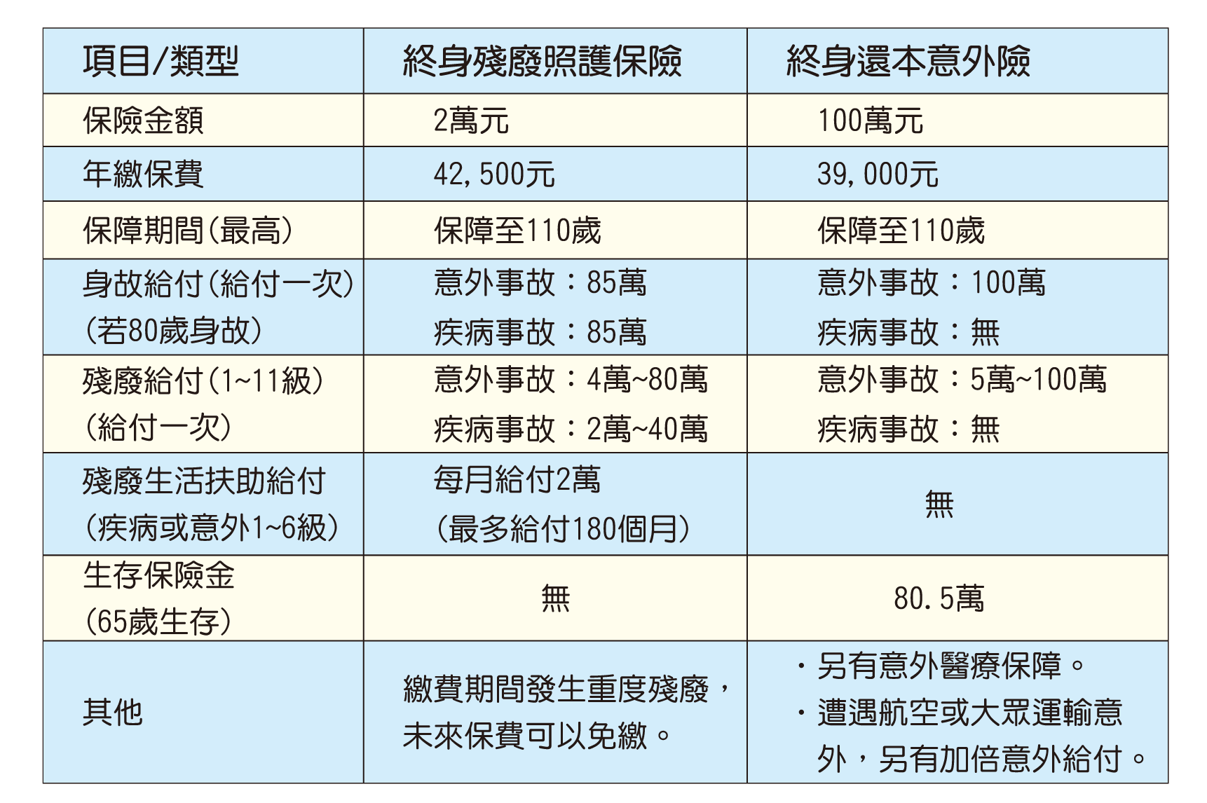 相較之下,選擇終身殘廢照護保險的優點是萬一因為「疾病或意外」造成重度殘廢,每個月能擁有殘廢年金給付,以支應部分的看護生活等費用;另外無論疾病或意外身故,都能夠遺留約當於累積所繳保費的身後費用給遺屬。另一方面,選擇終身還本意外保障的優點是擁有較高額的終身意外保障及意外醫療保障,而且65歲左右還能擁有約當於累積所繳保費的額外退休金。