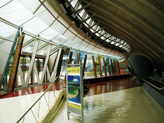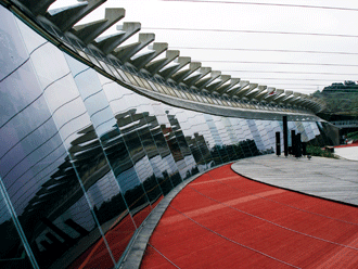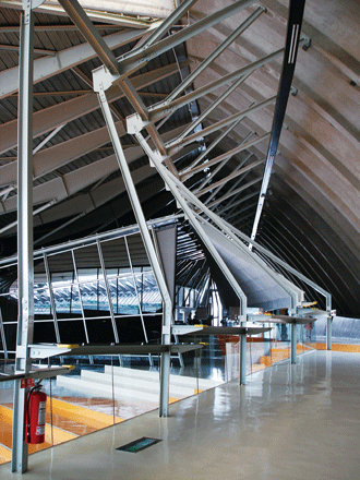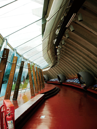 本案的細部設計也有精彩之處, 若仔細觀察建築面對斷層的一側, 除了採用大面落地玻璃, 其結構更使用了結構玻璃、鋼構、木材等不同材料,結合不斷變化的曲面,形成極具韻律感的線性展覽空間,而上方更有中空版結合電動天窗,達到遮陽、通風的效果。此外,建築與鋼索的銜接處,係以預力混凝土板的端點向外延伸出一類似骨骼的造型,除了結構意義外,更加強了「縫合」的意象,配合下方的鋼索,讓整個中庭成了極具動態的特殊風景。