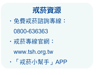 青少年可能因為情緒或壓力紓解、同儕認同而抽菸,戒菸時常會面臨到沒有其他適合的管道或方式來協助釋放壓力或緩解情緒,專線的諮詢人員可以提供想戒菸的青少年心理支持、陪伴與討論,以及免費的戒菸諮詢相關資訊、戒菸手冊。透過與諮詢人員的討論,可以協助他們擬定戒菸策略與計畫;並針對青少年戒菸時常見:對於戒菸感到焦慮與不安,或害怕因此影響人際關係,失去同儕間的認同與支持等困境,探討可行的解決方案,讓青少年戒菸時更具信心,不再孤單! 青少年朋友戒菸需要你我一同協助,陪伴他們一起面對戒菸的掙扎與矛盾。健康是人生最寶貴的資產,青少年朋友應該做自己的主人,勇敢戒菸;家長也需主動關心孩子並與孩子一同參與戶外健康休閒活動,遠離菸害。青春不留白,勇敢戒菸我最酷!