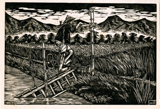 作者在廈門美專習油畫, 深受西方藝術的影響,因此在版畫創作中結合西畫的透視法則,並採用一觀察視點,使畫面展現新意。有時運用景物的遠近、對稱性、格柵圖案、對角線、朝上的走勢結構、明暗對比等手法,畫面充滿變化和旋律。也利用反襯手法(黑白對比),拉開了空間暗示距離,如此紮實厚重又有層次有呼應的構成,實已為版畫開了新境界。作品如1974年〈小畫家〉、〈蘇鐵〉及1977年〈紅牆上的睡女〉等。