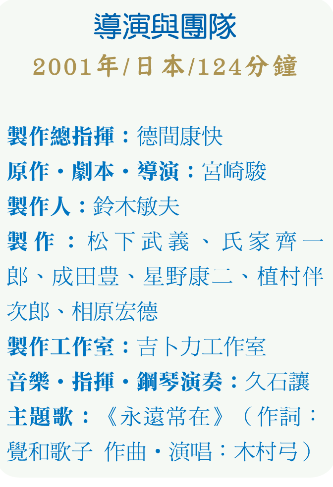 《神隱少女》是由吉卜力工作室製作的日本動畫電影,劇本和導演為宮崎駿,此劇亦為宮崎駿帶來事業輝煌的成就,宮崎駿憑這部電影在2002年贏得第75屆奧斯卡金像獎最佳動畫長片獎,也獲得2002年第52屆柏林影展金熊獎的最佳動畫片獎,成為日本第一部贏得奧斯卡最佳動畫長片獎的動畫電影。但是,當年宮崎駿為了抗議美國發動伊拉克戰爭,拒絕出席2002年的奧斯卡頒獎典禮,宮老先生可說是有原則、有個性的動畫大師!