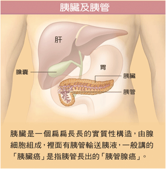 胰臟癌一開始是怎麼發生的?胰臟是一個扁扁長長的實質性構造,由腺細胞組成,從外型來看是一塊肉,裡面有胰管輸送胰液,一般講的「胰臟癌」是指胰管長出的「胰管腺癌」。至於像蘋果創辦人賈伯斯罹患的「胰臟神經內分泌瘤」則不屬於此種。