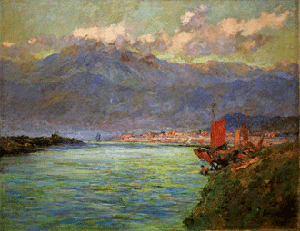 寫生水彩方面,石川欽一郎(1871-1945)與當時水彩畫家如丸山晚霞(1867-1942)、三宅克己(1874-1954)、大下藤次郎(1870-1911)、石井柏亭(1882-1958)也難得的共同展出作品。最值得一提的是,石川欽一郎在1907年以臺灣總督府陸軍部幕僚附陸軍通譯官身分第一次來臺,以水彩描摹這片土地的美好風光。1927年在第一屆官辦臺展肩負美術教育使命,他罕見以油彩作品《河畔》作為示範。取景於大稻埕河岸邊遠眺淡水方向,層疊的山巒,可清晰辨識出七星山、大屯山、圓山的稜線。然而這幅畫隨著1945年日本戰敗後也在藝壇上消聲匿跡,僅留下新聞資料。事實上這幅作品被當時喜愛藝術的一位周醫師偶然機緣購買,闊別近60年後又再次重現在大家眼前。