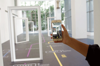 北師美術館在2012年開館首展《序曲展》曾將二樓挑高空間以立體年表呈現時空進程。此次《日本近代洋画大展》則以日本美術官展、在野的歷史演進,平行對應著臺灣美術史的時間軸線,形式上挑戰開發擴增實境科技,觀眾可攜帶平板裝置自由的遊走進時光機,讓虛實影像迎面而來。展櫃內呈現珍貴的畫家調色盤,透過光電感應的科技將斑剝顏料的光轉譯為數位編碼,引領我們進入畫家的世界,開啟多重感官體驗與探索。