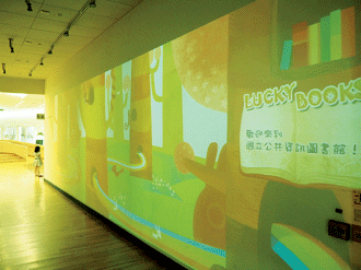 Lucky Books體感走廊,趣味結合互動科技,只要讀者經過即可與牆面的影像互動,並隨機推薦熱門讀物。同時,導覽牆也提供客制化服務,只要感應過讀者證,則會分析讀者借閱紀錄,以讀者使用習慣分析推薦合適的書籍。