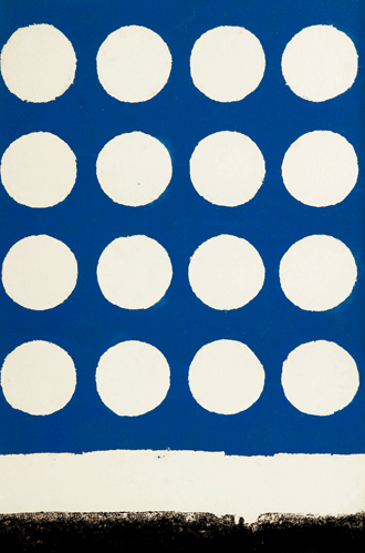 作者的現代版畫創作出現套印绽藍色面的計有:「海韻」、「星星的假期」、……「夢在冰河」、「星系」等系列,及同年份創作「晝與夜系列」部分作品。這些作品集中在1969到1974年間,令人好奇是否因獲得國際大獎與金爵獎之故。作者解釋是因為手臂受傷,經醫生建議以晨泳改善,所以天天浸泡水中而獲得靈感。本作品以鏤空16圓球的藍色占滿4/5畫面,隔白用一長條黑面沉底。上方象徵著藍色天宇有著許多的發光星體,下方是黑色的水平地面。這樣的構圖,讓人如在夜空冥想,寂靜仰望星星一顆顆旋轉變大,帶來震撼。