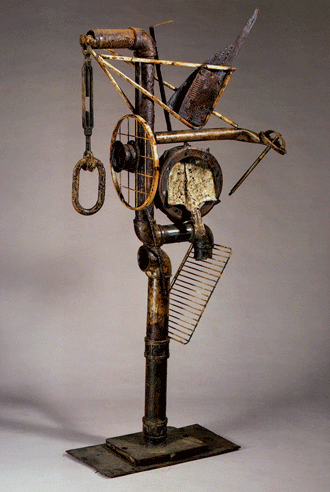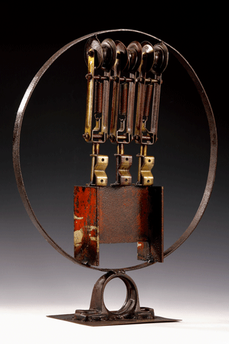 這件雕塑作品起碼結合了十幾種以上我們已經丟棄的日常用品及原料,像鎖環、渦爐蓋、U型水管、圓鍬、細鋁條、吊架以及探油用的針管。在所有人眼中,這些物件幾乎都是嚴重汙損毀壞,大半只能宣告完全無實用價值。經過作者藝術家的慧眼、愛心、靈思及巧手,它們起死回生變成一個藝術新生命。欣賞這樣的作品需要三個轉折:1.需回想生活經驗中看過賣藝人的種種表演。2.需有活化組構造型體的想像能力。3.需喜好實景與藝術雙向情感交流的分享。
