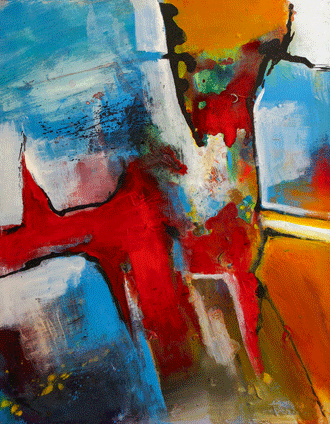 除了思考解決版畫媒材蔗板停產的危機,似乎也想在套版印畫之外,尋求另具東方詩意的新表現。畫在畫布上的壓克力創作,約始於1986年,和彩墨同樣企圖破解版畫的局限,壓克力畫更重視畫面結構的充實感,以及打破邊形佈局的處理。相對於彩墨渲染流動性的視覺效果,壓克力比較注意筆觸與肌理的平衡堆疊。材料的屬性影響著形式表達的感受,壓克力畫喜歡切換無數不規則的方圓,使它們依時空狀況自由變相。有了這些複雜形色關係的演練和推敲,直接間接都輔助了陳庭詩晚年鐵雕的構成組合。所以彩墨和壓克力,也可說是陳庭詩版畫和雕塑思考創作的潤滑劑與發想實驗地。值得同時一起觀賞、比對!