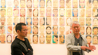 蔣勳老師與學生魏禎宏藝術家,背景作品為《閉上眼睛》系列。