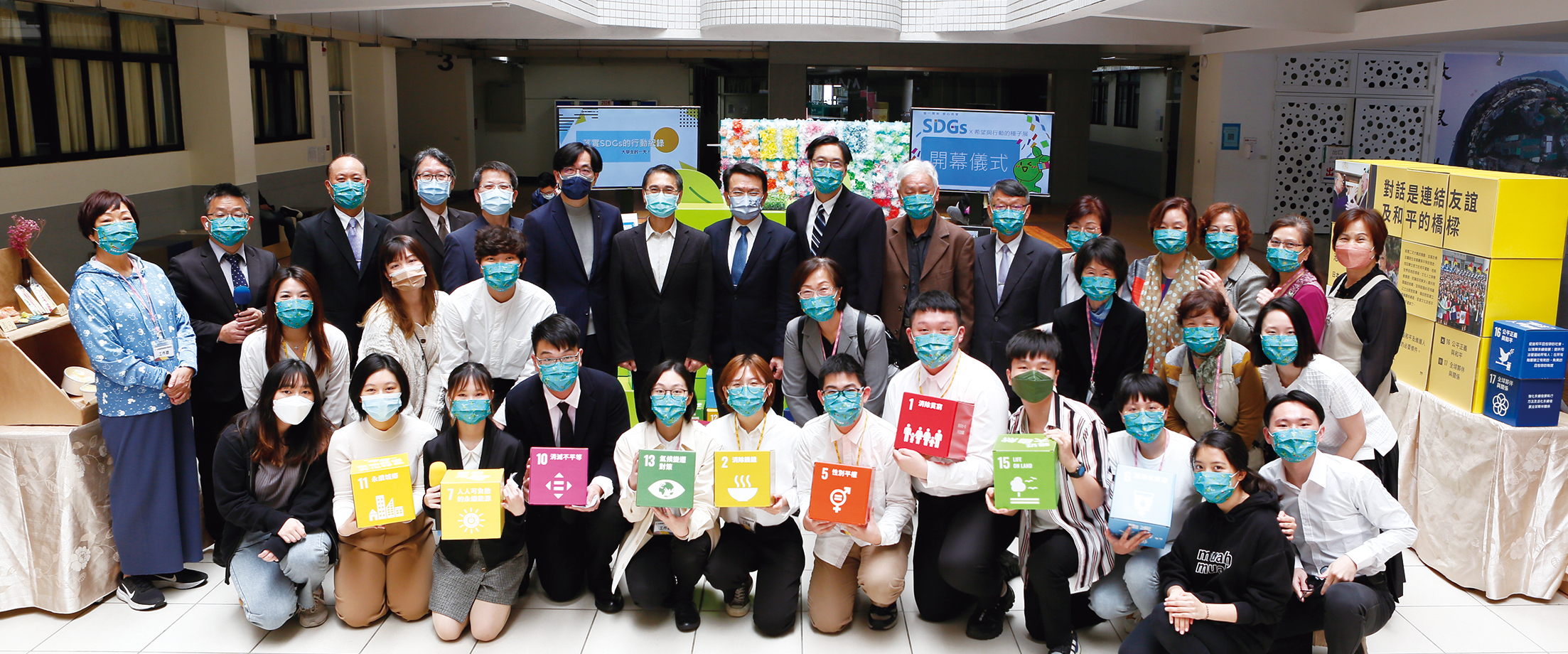 創價在淡大舉行SDGs展,副校長何啟東(後排左8)主持開幕典禮。