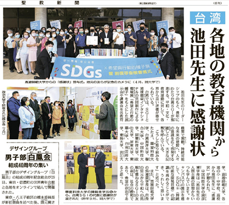 10月30日,《聖教新聞》先以「台灣各地教育機構頒發感謝狀給池田先生」為標題,報導台灣SGI與政治大學、高雄師範大學、中國科技大學、東華大學、台南藝術大學等校共同舉辦SGI與「國際地球憲章」共同策劃的「希望與行動的種子展」,廣獲各校高度肯定的情形,並報導各大學頒發「感謝狀」給池田先生的訊息。