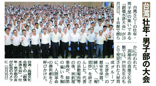 11月3日,再刊登台灣SGI舉行「水滸大會研修」的盛況。報導中提到:「壯年部、男子部一起學習戶田先生所創立人才單位『水滸會』之歷史及《御書》〈報恩抄〉」,並提及:「林釗理事長前往高雄場次鼓勵壯年部、男子部,胸懷師弟的誓言,譜寫自身人間革命的勝利劇。」