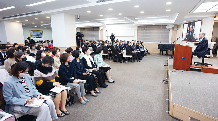 教學中,林理事長針對〈諸經與法華經之難易事〉所說:「佛法日漸顛倒,世間也變得濁亂。佛法就像身體,世間就像影子。身體彎曲則影子就歪斜」,指出──如果作為人根柢的思想(體)不正確,就會給社會(影)帶來負面影響。