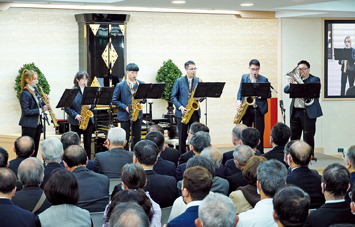 當天,在「天鼓樂團」以管樂六重奏表演〈Bandolier March〉及〈人間革命之歌〉等樂曲中,為教學揭開序幕。
