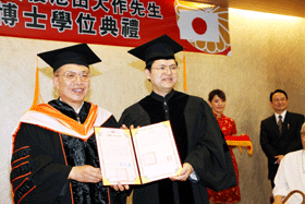 2004年3月29日池田SGI會長獲國立屏東科技大學頒發名譽農學博士,由池田博正副會長(左)代表接受。