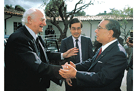 1987年,池田SGI會長與榮獲諾貝爾化學獎及和平獎的波林博士(左),以「探求生命的世紀」為題展開對談。