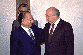1990年,池田SGI會長與前蘇聯總統戈巴契夫(右)進行對談。