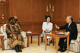 2005年,池田SGI會長與諾貝爾和平獎得主萬嘉麗馬阿薩伊(左)對談。