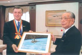 2003年池田SGI會長與太空飛行員謝列布羅夫(左)對談。