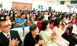 水碓地區場次(淡水區)18日在龍峰講堂舉行。就讀淡江大學四年級的張晶惠,克服視障困難,與大學會夥伴一起上台帶動大合唱,她用心記住每一個動作,認真開朗的姿態,讓台下許多會員深受感動。來自希臘、受到太太鼓勵入信的男子部邵瑞託(Christos),挑戰以中文分享信心體驗,目前擔任英文教師的他,深受牧口創會會長的教育理念感動,不僅決意要成為帶給學生幸福的教師,更鼓勵其他外籍老師加入創價行列,透過信仰人性變革的過程,獲得大家熱烈掌聲!