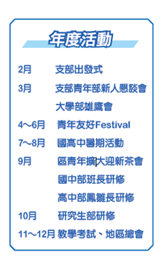 「在夢想的前方,有更廣大的舞台,我們稱之為使命。」會中,藉由觀賞《鼓勵的繫絆》、《在夢想的前方》兩部影片,與會青年感受到人際關係日益疏離的現代社會,創價致力締結綿密的關懷網絡,是連結人心的一股重要力量。年度企劃說明單元,透過精心製作的投影PPT,讓大家更了解嶄新一年的前進節奏,進而立下