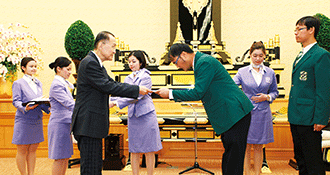 為鼓勵在第一線奮戰、率先展開對話擴大的創價班員,林釗理事長特別頒發「創價班榮譽徽章」給74位代表;透過挑戰出席4次以上勤務訓練及學習會,今年度正式成為班員的202位新成員,由前輩披上創價班外套,一同高喊「題目繫絆、誓願共戰」,歡喜踏上利他奉獻、守護民眾的光榮大道。