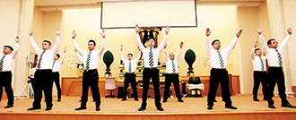 創價班負責人黃治綱帶領大家決意:「全體創價班以鋼鐵般的團結,肩負起廣宣流布的使命,率先於廣布第一線展開對話,成為弘教擴大的先鋒。高舉妙法旗幟,徹底面對現實生活嚴峻挑戰,展開人性變革,贏取勝利!」