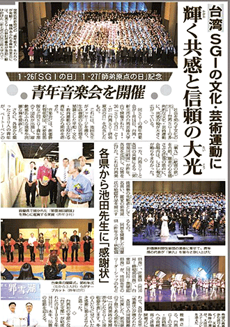 日本第三大報、每日發行量高達550萬份的《聖教新聞》,2月2日第二版大幅報導台灣SGI舉辦「1.26 SGI之日暨1.27台灣師弟原點之日」青年團隊紀念音樂會,及創價舉辦「樂山樂水 郭雪湖回顧展」東部巡迴展、池田SGI會長獲各地縣政府頒發「感謝狀」的消息,大力讚揚台灣以文化、藝術運動,擴展社會各界共鳴與信賴的行動。