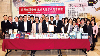 為感謝池田SGI會長的厚意,薛富盛校長(中間持狀者左)在圖書館舉行了隆重的贈書暨頒發「感謝狀」典禮,由執行長林廷鋒代表接受感謝狀。