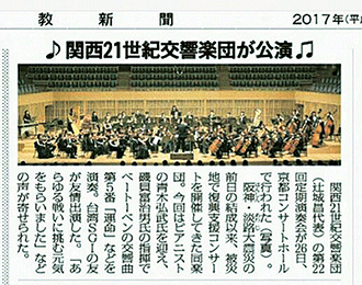 26日,關西21世紀交響樂團於京都音樂廳舉行「第22回定期演奏會」。該團成立於1995年1月16日,隔天即不幸發生阪神大地震,因此,他們從成立之初即以鼓勵災民作為目標,每年年初舉行「精神復興音樂會」,迄今已與世界10多個國家、超過350位音樂家合作,舉行各種慈善演出。