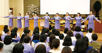 這支身著紫色衣服的美麗隊伍,在藝文中心開幕剪綵、藝文講座、教育講座、各類研修會等活動中,透過她們的明朗笑容、優雅儀容及親切態度,充分展現《法華經》所說:「當起遠迎,當如敬佛」的精神,贏得各界的普遍讚賞,擴大識者對創價的理解!