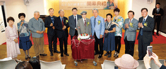 藝文界貴賓到場祝賀畫展開幕、慶祝沈哲哉91歲生日,包括奇美博物館顧問潘元石(左3)、跟隨沈哲哉習畫的郭綜合醫院院長郭宗正(右2)、郭柏川之女郭為美(右4)、永都藝術館創辦人侯博明(左6)。
