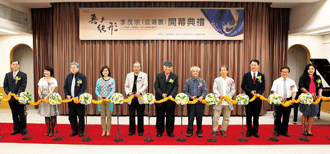 左起:光榮國小校長林九牧、錦和國小校長李高財、板橋國中校長吳吉助、板橋區公所視導郭瓊英、致理科技大學校長尚世昌、創作者游明龍教授、台師大名譽教授王秀雄、台師大教授巴東、明 德高中校長張錫勳、三和國中校長施青珍、同榮國小校長鄭美玲、洪玉柱副理事長。 |
