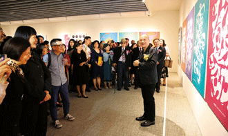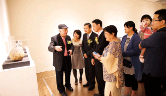 游明龍教授( 右) 為與會貴賓導覽作品。 |