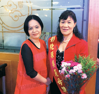 4 月2 4日,彰化一區謝貴霞(右)在彰化縣總工會主辦的「五一勞動節暨母親節表揚大會」,榮獲「模範母親」表揚。