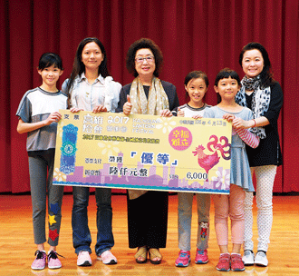高雄北區未來部、就讀高雄市文府國小的龔靖茵(右2)及胡馨尹(右3)、胡安棋(左1)姐妹,參加「2017高雄燈會藝術節─全國創意花燈競賽」,榮獲「國小、幼兒園組優等獎」,並在有數百萬人次參觀的2017高雄燈會藝術節中展出,4月13日特別接受高雄市教育局長范巽綠(左3)頒獎表揚。