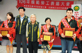 台中北區婦人部鄭彩暖(左4),於台灣電力公司服務38年、表現優異,4月12日榮獲台中市產業總工會頒發「模範勞工」。