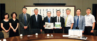馬場校長(左5)贈送池田SGI會長攝影集與聖教新聞給薛富盛校長(右4)。